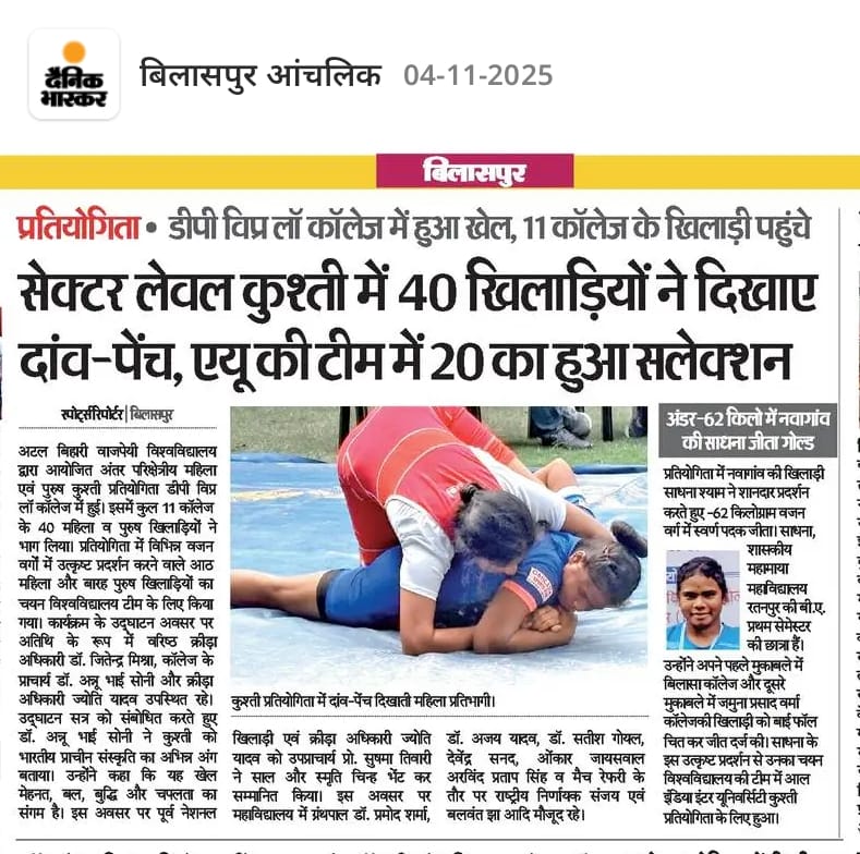 03-Nov-2025 Sports Department बीए प्रथम सेमेस्टर की छात्रा का 62 किलोग्राम वजन वर्ग में स्वर्ण पदक